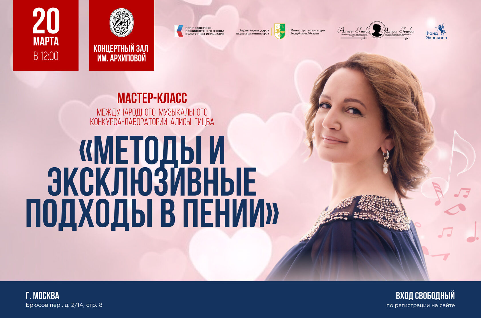 20 марта 2026 г. 12.00 в рамках второго этапа IVМеждународного музыкального конкурса-лаборатория Алисы Гицба в Архиповском зале пройдет мастер-класс «Методы и эксклюзивные подходы в пении» заслуженной артистки России, народной артистки Абхазии, солистки московского музыкального театра «Геликон-опера», художественного руководителя и автора международного музыкального конкурса-лаборатории «Музыка – диалог без расстояний и границ», а в 19.00 здесь же пройдет концерт лауреатов конкурса 2025 г.